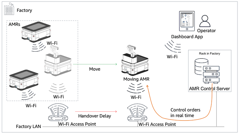 マキノのAMRは制御サーバーから要求を受け取り、自律的に移動してその要求を処理します。これまで、マキノは AMR とサーバー間の通信に Wi-Fi を使用していました。サーバーは、HTTPSやWebRTCなどの複数のプロトコルを使用して要求メッセージをAMRに送信します。これには、安定した中断のない通信が必要でした。しかし、移動中の AMR とサーバー間の通信が不安定になることがありました。AMR が Wi-Fi アクセスポイントの圏外に移動して接続が切断されると、別のアクセスポイントへのハンドオーバーに時間がかかります。マキノは、Wi-Fiハンドオーバープロセスの遅延がこの不安定性の原因であると特定しました。これを解決するには、アクセスポイント間の安定したハンドオーバーが必要です。