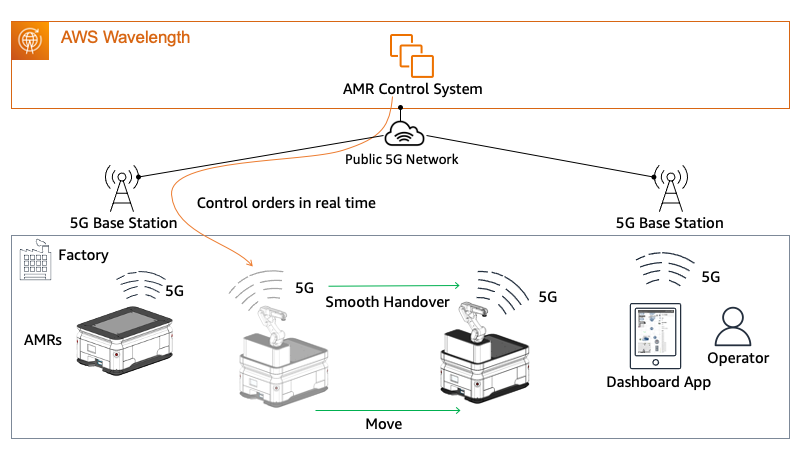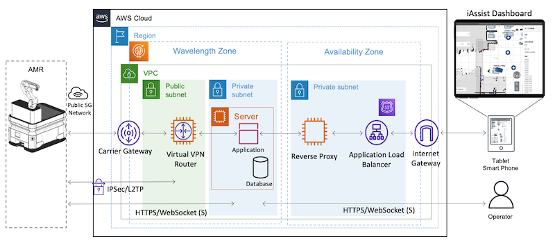 AMRの制御サーバーは Wavelength Zoneにあります。AMR とサーバーは、パブリック 5G ネットワークを介して通信します。制御用のタブレットとサーバーはインターネットを介して通信します。