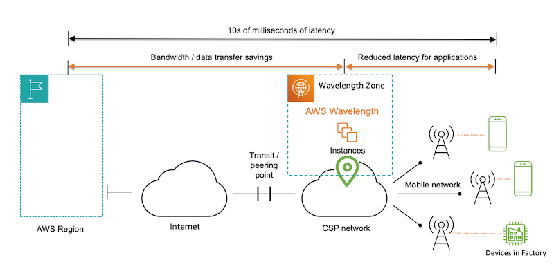 AWS Wavelength は、モバイルキャリアが所有する 5G 基地局ネットワーク上の AWS リソースを使用して処理を行うサービスです。5G基地局のすぐ近くで処理を実行して応答できるため、AWS Wavelength は 5G 通信の低レイテンシー処理に最適です。日本の大手モバイルキャリアであるKDDIは、AWS Wavelengthをサポートしています。