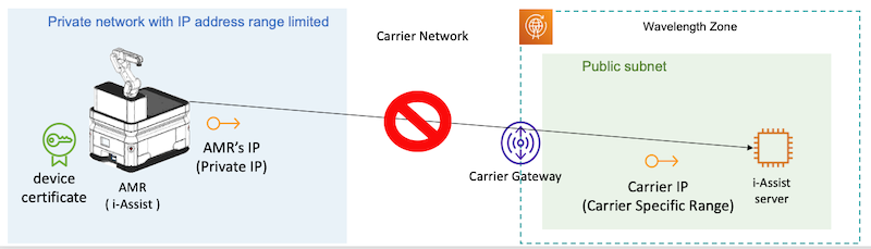 IPアドレス範囲:通常、工場の機器はプライベートIPアドレスを使用します。マキノのAMRには、特定のプライベートなIPアドレス範囲が必要でした。一方、AWS Wavelengthによって付与されるIPアドレスの範囲は、キャリア固有のグローバルIPアドレスで構成されます。