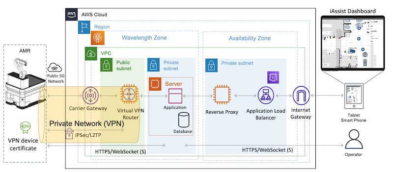 同社は慎重に検討した結果、これらの問題の解決策を見つけました。同社は Wavelength Zoneに VPN ルーターインスタンスを作成しました。VPN ルーターは各 AMR への VPN トンネルを確立し、AMR のプライベート IP アドレス範囲からの通信を可能にします。デバイス認証は、VPN トンネルの接続時にVPNのクライアント証明書を使用して行うことができます。
