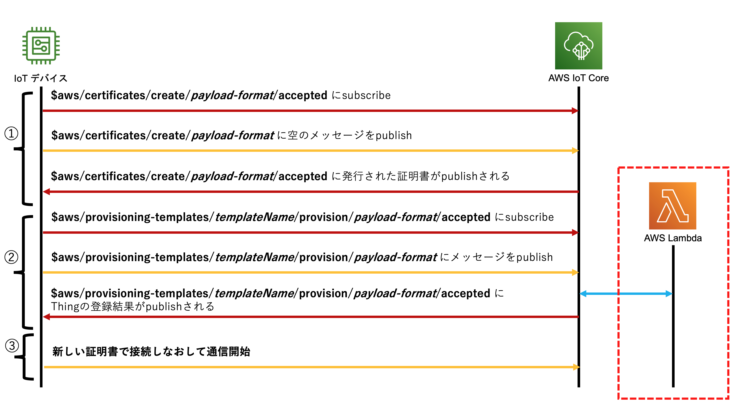 ②の処理では ①のMQTTコネクションをそのまま利用し、Thing の登録結果を受け取る Topic に Subscribe し Thing の登録を要求する Topic に①の処理で受け取ったトークンと Thing 登録で使うパラメータを Publish します。 Subscribe してある Topic に Thing 登録の結果が Publish されてきます。デバイス側ではこの結果を見て、正常に登録されたことや Thing 名、その他追加の情報を受け取ることができます(詳しくは Thing の登録を参照)。 Thing の登録を要求する Topic では、プロビジョニングテンプレートを指定して必要な Thing などを作成し、 IoT Policy と証明書を関連づけ、証明書を有効にします。この時に、プロビジョニングフックとして AWS Lambda を実行することができますので、登録しても良いデバイスなのかのチェックや、プロビジョニングテンプレートへ渡すパラメータの作成、そのほかの関連処理を実行してから Thing の作成を実行することができます。