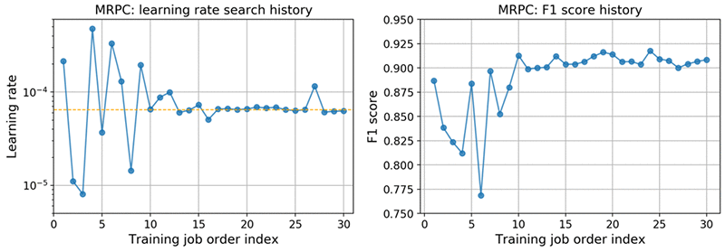 MRPC の GLUE データセットによる自動モデルチューニングの結果