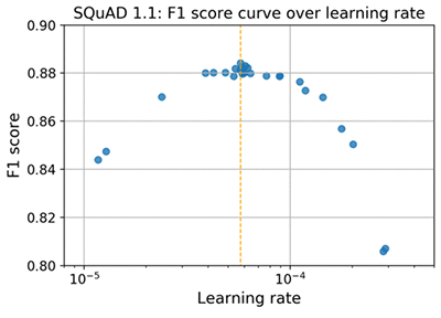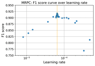 次のグラフは、F1 スコアと学習係数の関係をプロットしたもので、モデルのハイパーパラメータに関する感受性を表しています。この結果は、BERT の uncase ベースのトレーニング済みモデルを使い、MRPC dev データセットから得られたものです。