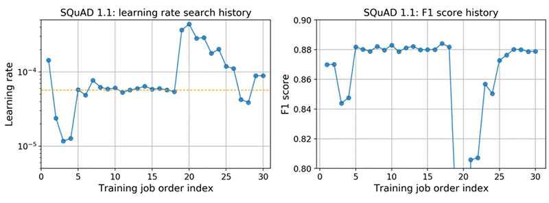 SQuAD 1.1 データセットに対しても、前出のものと同様の自動モデルチューニングが行えます。このデータセットは、10 万組の質問と解答のペアを不特定の対象から収集したものです。SQuAD データセットでファインチューニングを行うことは、ハイパーパラメータを別の NLP タスク用に変更しながら、 (約 5,000 組の対話を収録している) MRPC データよりも大きいデータセット用にチューニングしなおすことでもあります。詳細なコードはこちらのノートブックで入手できます。
