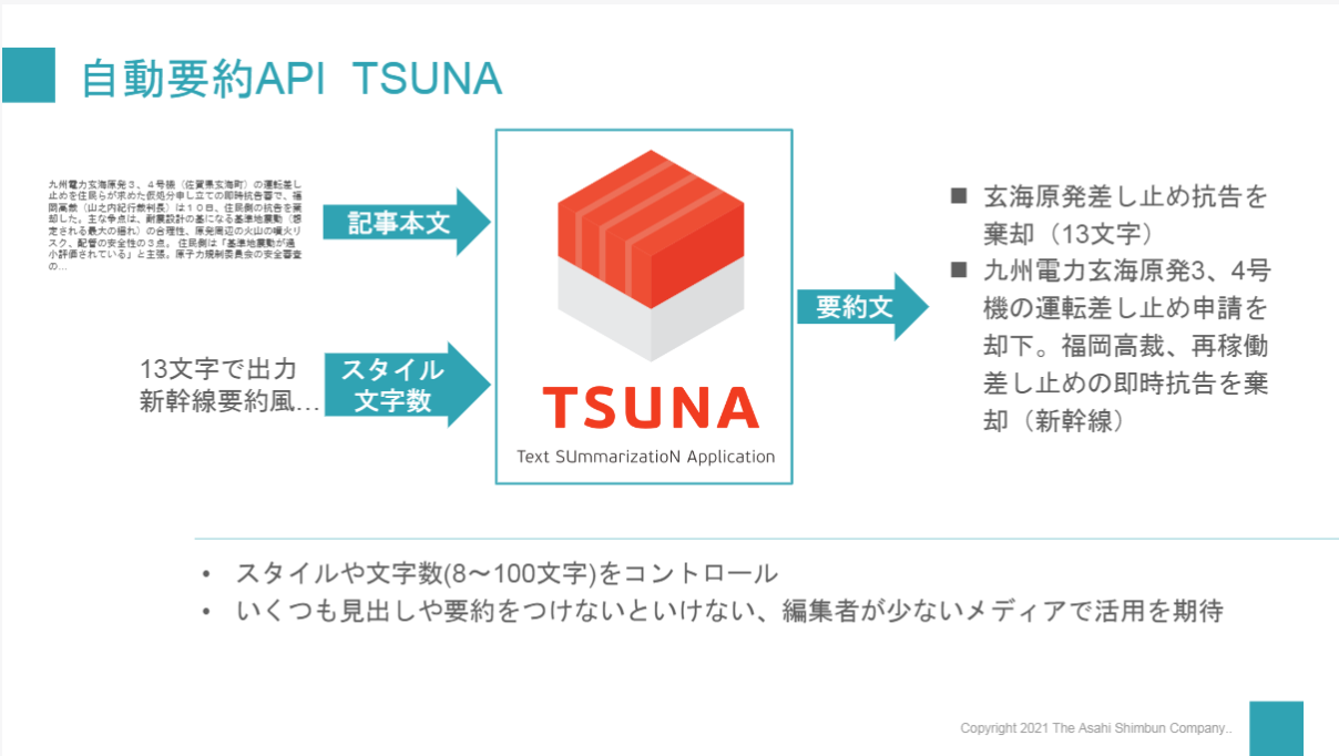 最初に昨年サービス提供を開始した、自動要約アプリケーション「TSUNA(Text SUmmarizatioN Application)」についてご紹介いただきました。TSUNA は朝日新聞社が大量に保有している過去 30 年分の記事データを、効率よく処理させるために前処理・フィルタリングをした上で、ディープラーニングを用いて学習した言語モデルを活用しています。スタイルや文字数(8~100文字)をコントロールして、リクエストした本文から自動的に文章の要約を行い、見出しや要約を瞬時に作成することができます。本セミナーでも実際に要約を作成するデモを見せていただきました。