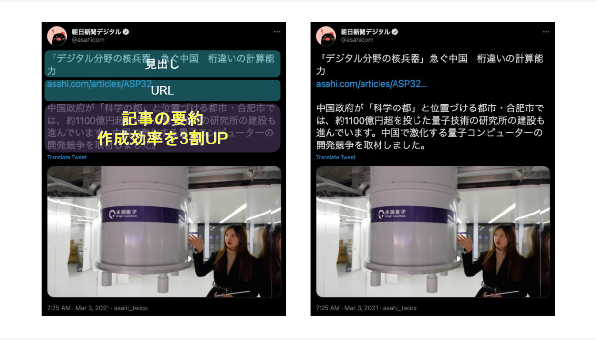 TSUNA は既に業務にも組み込まれていて、電子掲示板で新幹線などの速報テロップ向けに提供されている、短文要約の作成業務を約 90 分から 1 分へと短縮したとのことです。また おすすめ記事のツイートなど、掲載するメディアによってレギュレーションの異なる、見出し・要約文を作成する業務で効率化・省力化に貢献しているとのことです。