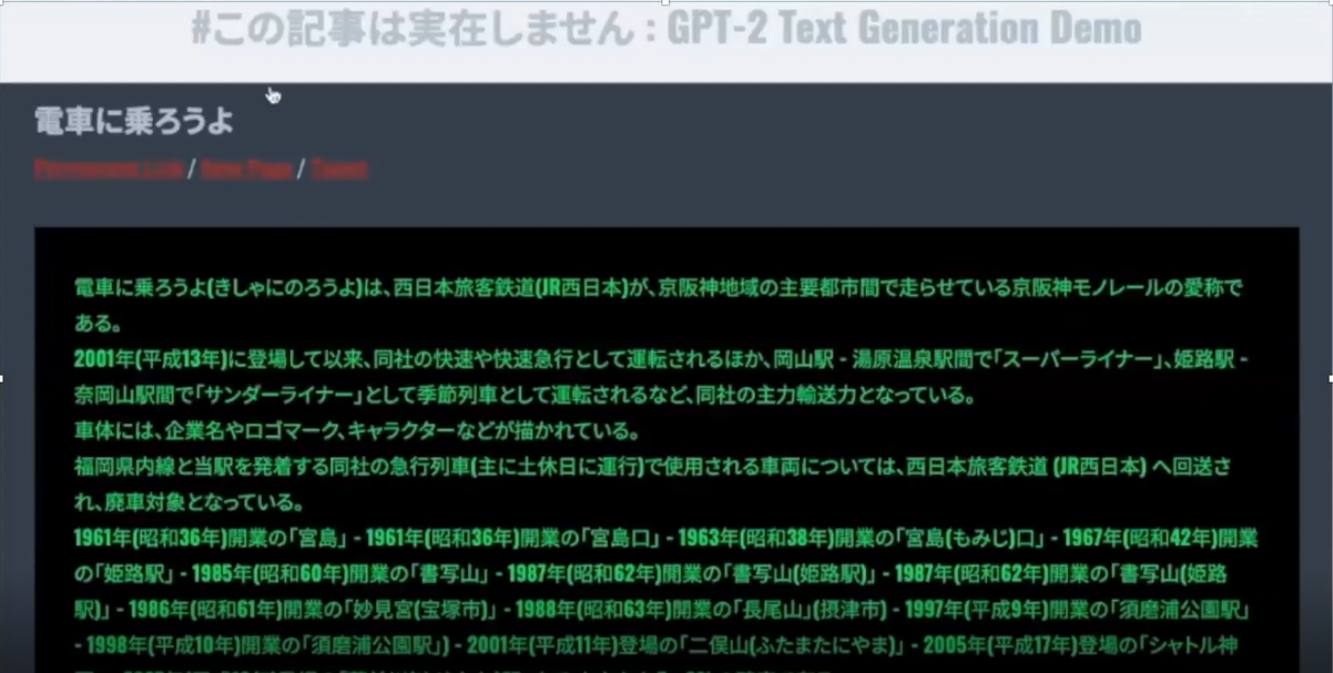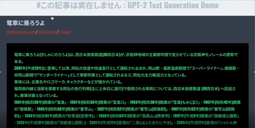 朝日新聞社の機械学習モデル(GPT-2言語モデル)を使って、短いキーワードから自動的に文章を生成するデモを見せていただきました。