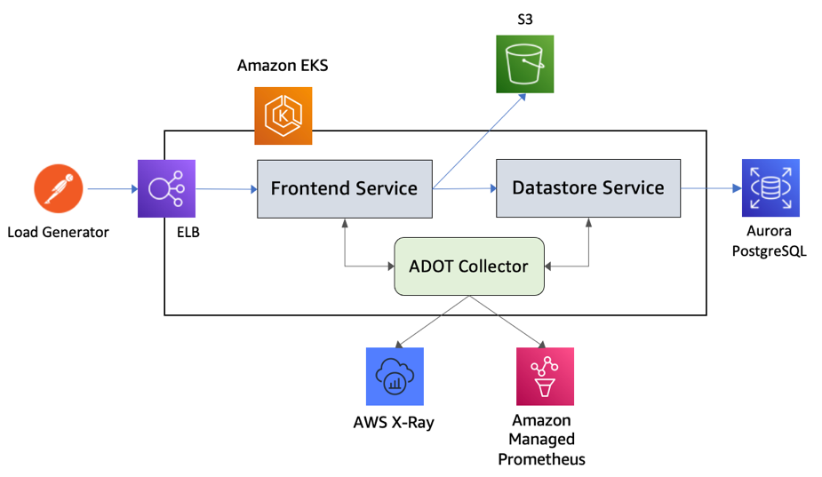 では、これらをすべてまとめて、EKS クラスターにデプロイされたワークロードからのメトリクスとトレースの収集をテストしてみましょう。次の図は、このテストで使用したセットアップを示しています。これは、REST API のセットを公開し、S3 と対話するフロントエンドサービスと、Aurora PostgreSQL データベースのインスタンスと対話するデータストアサービスから構成されます。これらのサービスには、Prometheus クライアントライブラリと X-Ray SDK の両方を使用してインストルメントされています。前のセクションで説明した YAML マニフェストを使用して OpenTelemetryCollector カスタムリソースをデプロイすることにより、ADOT Collector が Deployment モードで起動されます。Postman クライアントは、フロントエンドサービスをターゲットとする外部トラフィックジェネレーターとして使用されます。