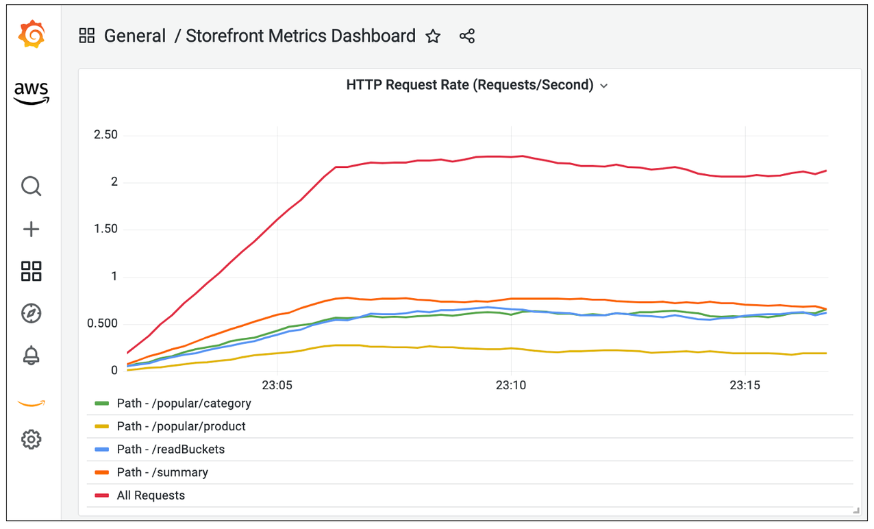 ADOT Collector は、フロントエンドサービスから http_requests_total という名前のメトリクスの Prometheus Counter をスクレイピングし、Amazon Managed Service for Prometheus に送信します。このメトリクスから PromQL 式 sum(rate(http_requests_total[5m])) を使用して処理される HTTP リクエストのレートを計算され、以下のグラフに示すように Amazon Managed Grafana で表示されます。