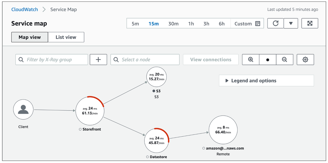 次のスクリーンショットは、サービスから取得したセグメントデータを用いて X-Ray が生成したサービスグラフと、各セグメントにおける平均応答時間を示しています。
