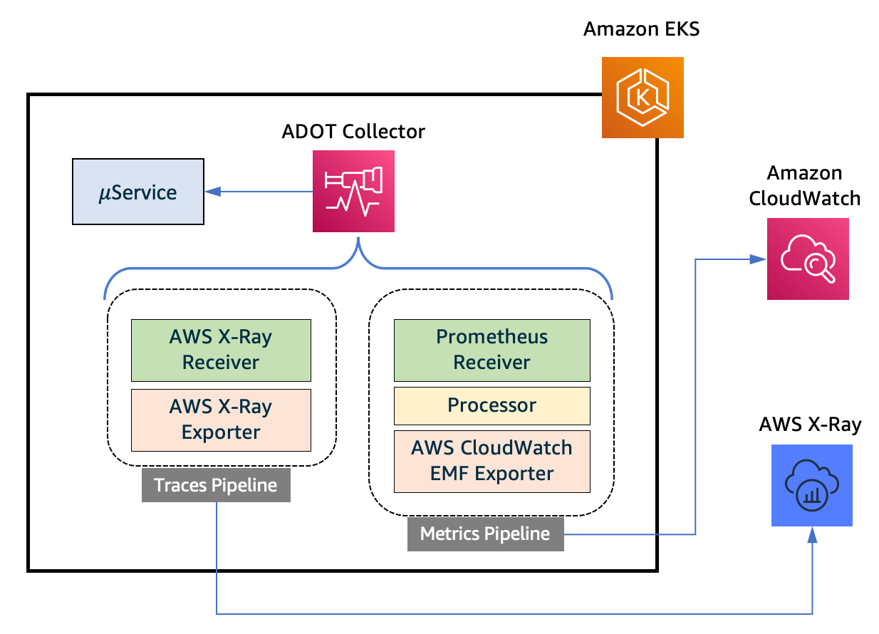 OpenTelemetry は、トレース、メトリクス、ログなどのテレメトリデータの作成と管理のために設計された API、SDK、ツールのセットです。AWS Distro for OpenTelemetry Collector (ADOT Collector) は、アップストリームの OpenTelemetry Collector の AWS サポートバージョンであり、EKS を含む AWS コンピューティングプラットフォームと完全な互換性を持っています。これにより、ユーザーはテレメトリーデータを Amazon CloudWatch、Amazon Managed Service for Prometheus、AWS X-Ray などの AWS マネージドサービスに送信できます。