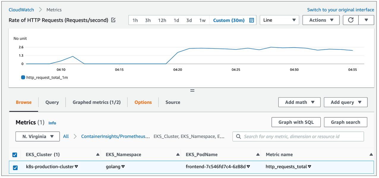 HTTP リクエストのレートは Metric Math 式を使用して計算され、以下のスクリーンショットに示されているように CloudWatch メトリクスダッシュボードに表示されます。