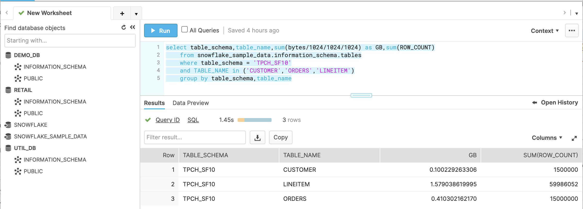 AWS Glue ジョブは、標準のワーカータイプを使用して Snowflake データを Amazon S3 に移動しました。このジョブは約 21 分で完了し、全体で 2.089 GB (約 7,650 万レコード) がロードされました。Snowflake コンソールの次のスクリーンショットは、Amazon S3 にコピーしたテーブルとそのサイズを示しています。