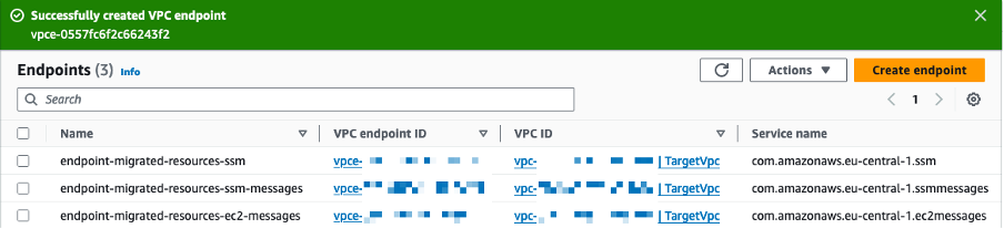 - 3 つの VPC エンドポイントが作成されると、以下のような結果が表示されます (図 4)。