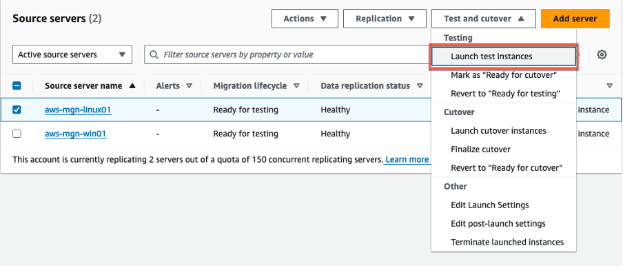 - テストを完了したいテストインスタンスが起動されているソース サーバーの横にあるチェックボックスを選択します