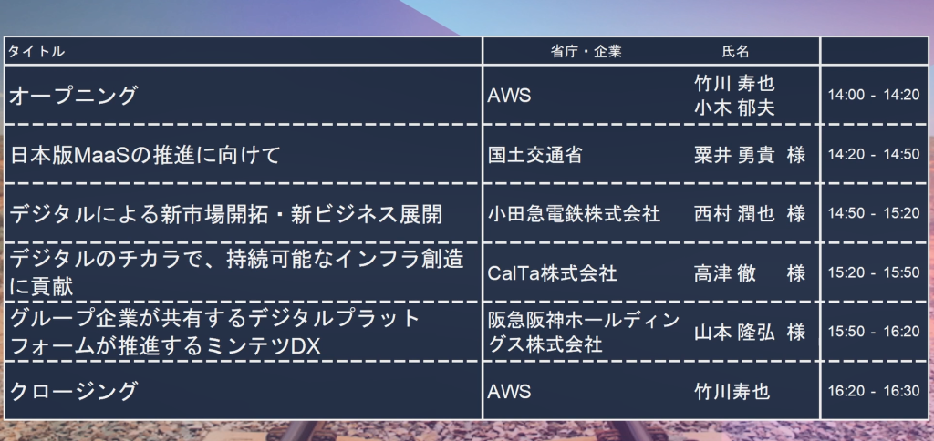 基調講演を受け、イベントホスト役のAWSの竹川は、「日本独自の社会構造・社会課題から、現状の政策、今後の発展の可能性まで、さまざまな角度からわかりやすくご紹介いただき、ありがとうございました」と述べ、後続のセッションへの進行が行われました。当日の「鉄道DXセミナー」の後半の模様については、こちらもご覧ください。
