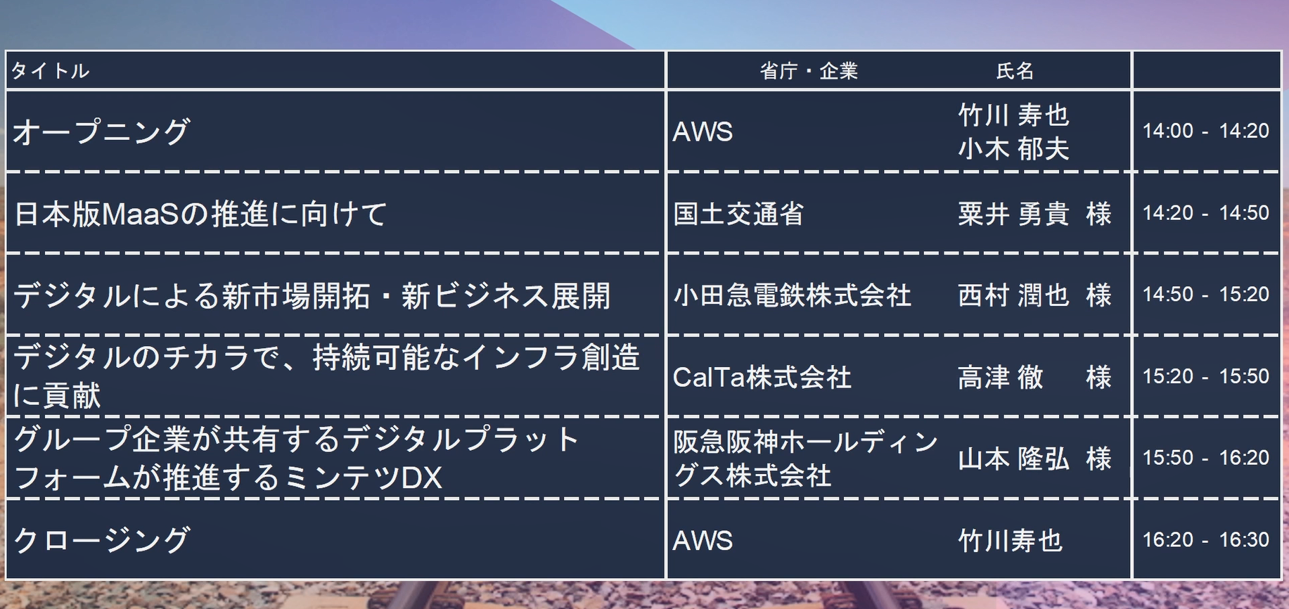 基調講演の開始に先立ち、AWSジャパン 事業開発本部の竹川寿也から “本日のセミナーでは、鉄道業界全体のDXをテーマとし、なかでも、「1.デジタルによる新市場開拓、2.現場業務プロセスの抜本的な効率向上、3.全社に影響するITオペレーションの刷新」が大きな主題である”──旨、全体の構成の予告がありました。 「本セミナーでは、“単に鉄道による移動にとどまらず、都市計画・娯楽・ショッピング・施設・製造にいたるまで” の幅広いテーマを変革するテクノロジーを主題として取り上げていきますが、これらのテーマ全てを少子高齢化や地域間連携等の社会課題に取り組みながら、横断的に所管しているのが国土交通省」である── として、基調講演のスピーカー紹介が行われました。