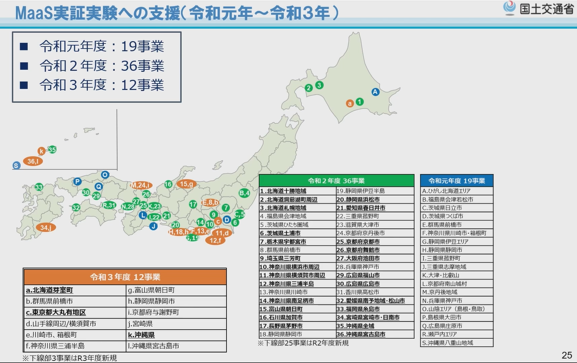 また、もう1種類の支援策としては、「MaaS実証実験への支援」が挙げられます。こちらは令和3年度までに延べ67地域への支援を行い、令和3年度には実証から実装へとステージが進んでいます。