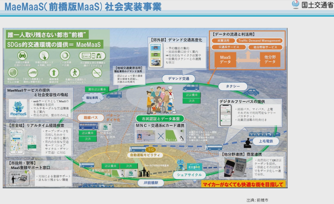この取り組みにおけるフロントランナーの1つは、前橋市の事例です。「MaeMaaS」として、社会実装が進んでいる事例を、紹介します。