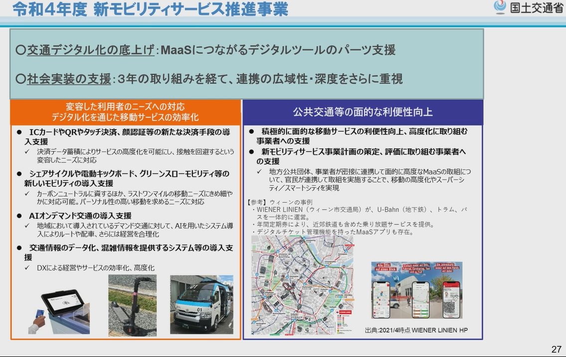 では、令和4年度の国交省の施策。どんなものがあるでしょうか? 最新の取り組みを一言で言うと、「先端的な取り組みのエリアを広げ、他分野と連携し、交通モードの多様化も図ってほしい」──。これが今年度の事業の狙いとなります(p.27)。──このように粟井課長補佐は紹介を続けます。