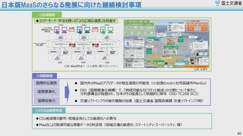 MaaSを構想する際には、分散したバラバラのものではなく、「1つのサービスであること」が大事であると粟井課長補佐はUI/UXの観点からも強調します。単なる移動だけでなく、観光・物流・医療、そうした「移動の目的に沿ったサービス」であることが望まれています。