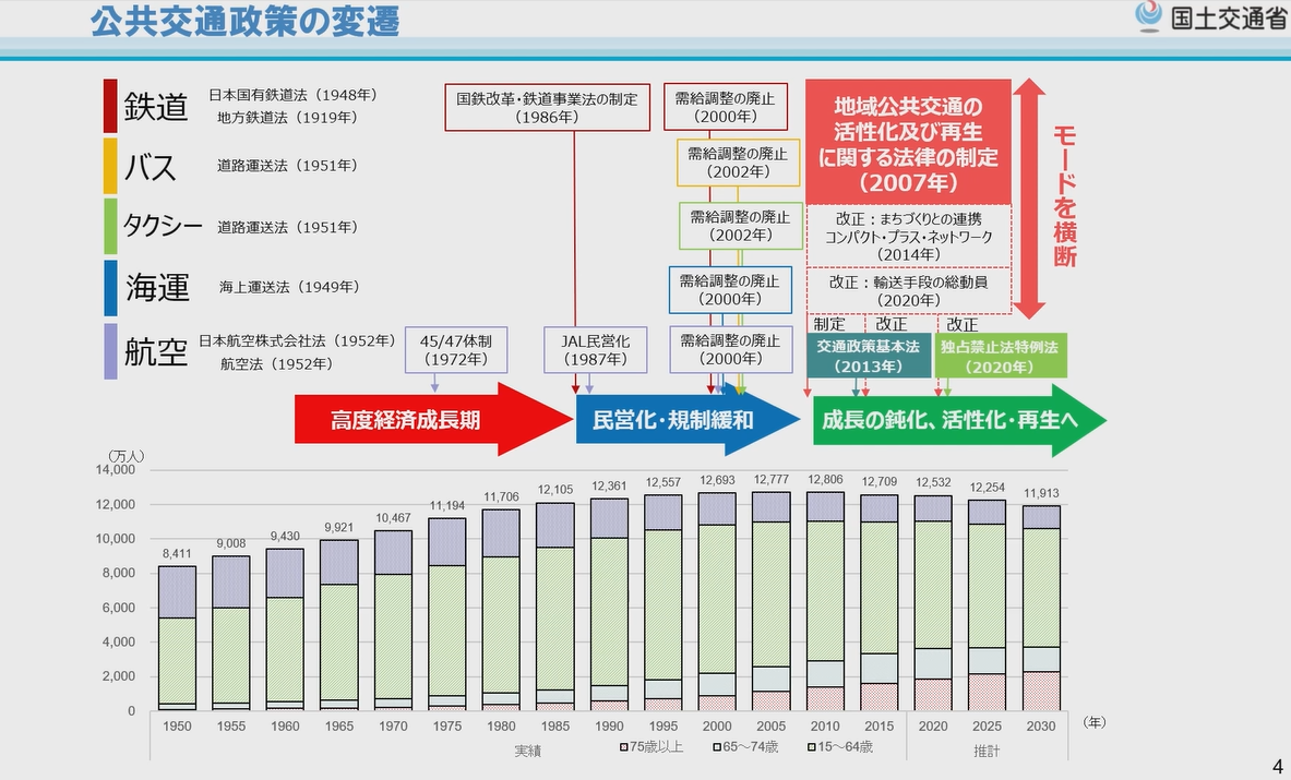 粟井課長補佐からは、まず、「公共交通政策の過去の変遷」を紹介いただきました。大枠のトレンドとして、「民営化の流れはありつつも、少子高齢化や廃線の問題にどう向き合うか」、「その活性化はどうあるべきかを国交省では考えてきた」──と述べます。そして、近時のキーワードの1つは、「共創」であり、1プレイヤー、あるいは1つの交通カテゴリーだけでなく、複数の主体が連携した取り組みを検討する必要がある──と述べます(投影資料 p.4)。