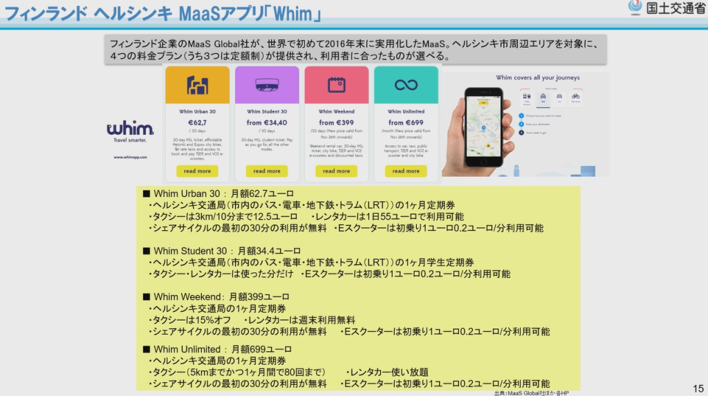 粟井課長補佐は、1つの先進事例として、MaaS発祥の地と言われているフィンランド Whimの事例を紹介します。MaaSアプリであるWhimは、電車、バス、タクシーなどの移動サービスをサブスクリプションにて提供しており、交通モードを跨いだシームレスな移動を実現しています。粟井課長補佐は、Whimがこのようなサービスを実現できている背景に、「公共交通の運営主体が国であること」──を指摘します(投影資料 p.15)。