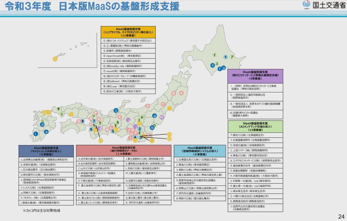 もう少し、国交省の取り組みをご紹介したいと思います。一つ目は、「日本版MaaSの基盤形成支援」です。上に紹介した「MaaSとしてのコロナ対応」、あるいはキャッシュレス決済の普及決済も、この取組の支援事例です。こちらのスライドのように、令和3年度には、日本全国で合計65箇所もの支援が行われてきました。