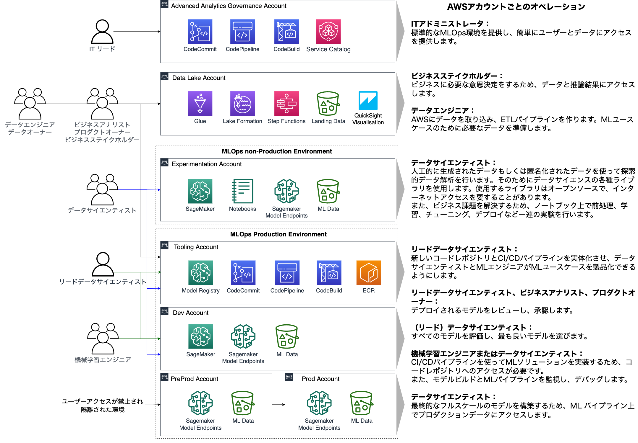MLOpsの成熟度モデルによって、アーキテクチャ設計とデリバリーロードマップが明確になります。各ペルソナが各々の運用において使用するAWSアカウントやAWSサービスについても、下の図で明確にしておきましょう。