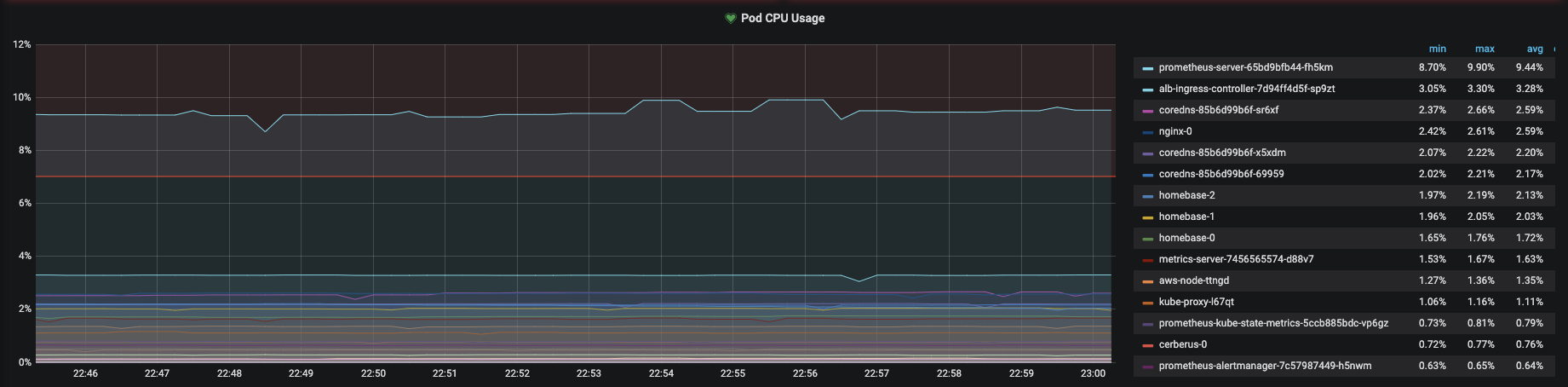 この式は、ポッドのコンピューティングリソースを監視し、コンテナのリソースリクエストを調整するタイミングを特定するのに役立ちます。リソースリクエストで宣言する値は、ポッドに割り当てる CPU とメモリの量を Fargate に指示します。ポッドのメモリと CPU 使用率が常にリソースリクエストで宣言した値に近づいていることに気付いたときは、リクエストされたリソースを確認するタイミングが近づいているのかもしれません。