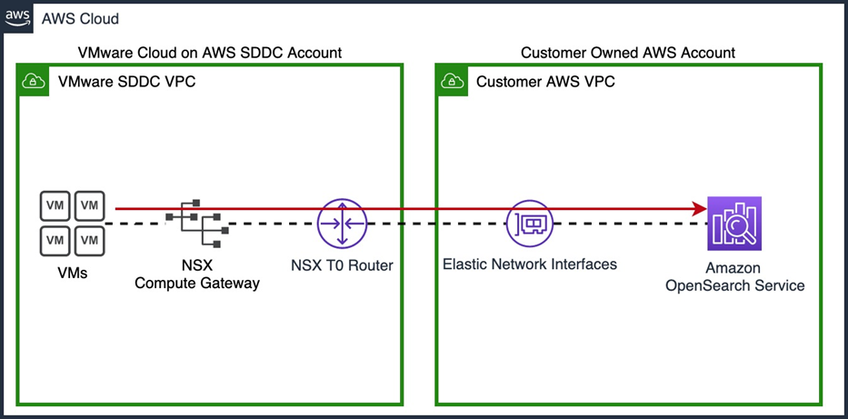 このENI接続によって、VMware Cloud on AWSでホストされる仮想マシンとネイティブAWSリソースの間に、広帯域幅、低レイテンシー、かつセキュアな接続が提供されます。本稿でご紹介するモニタリングソリューションもこのENI接続によって、VMware Cloud on AWS内の仮想マシン (VM) に対して活用することができます。