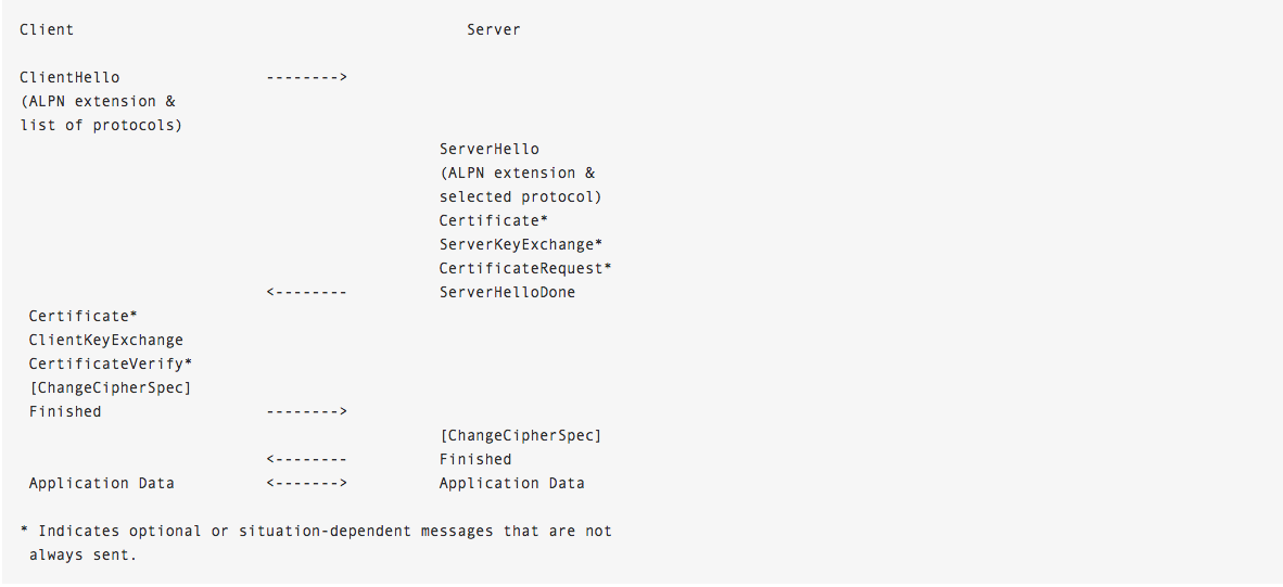 ALPN拡張を含む完全なTLSハンドシェイクは、次のように動作します