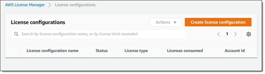 最初のステップは、1つ以上のライセンス設定を定義することです。 ライセンスマネージャコンソールを開き、[Create license configuration]をクリックして開始します: