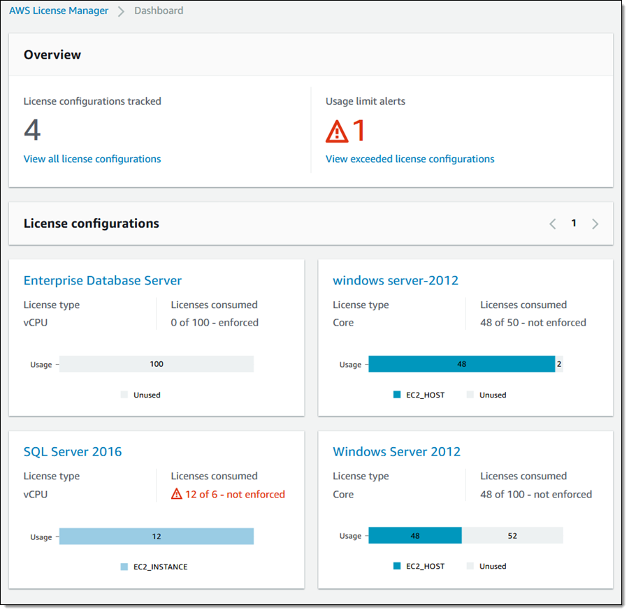 全体的なライセンスの使用状況を一目で確認できます(これは、複数のアカウントとAWS Organizationsと連携して機能するセントラルダッシュボード画面です):