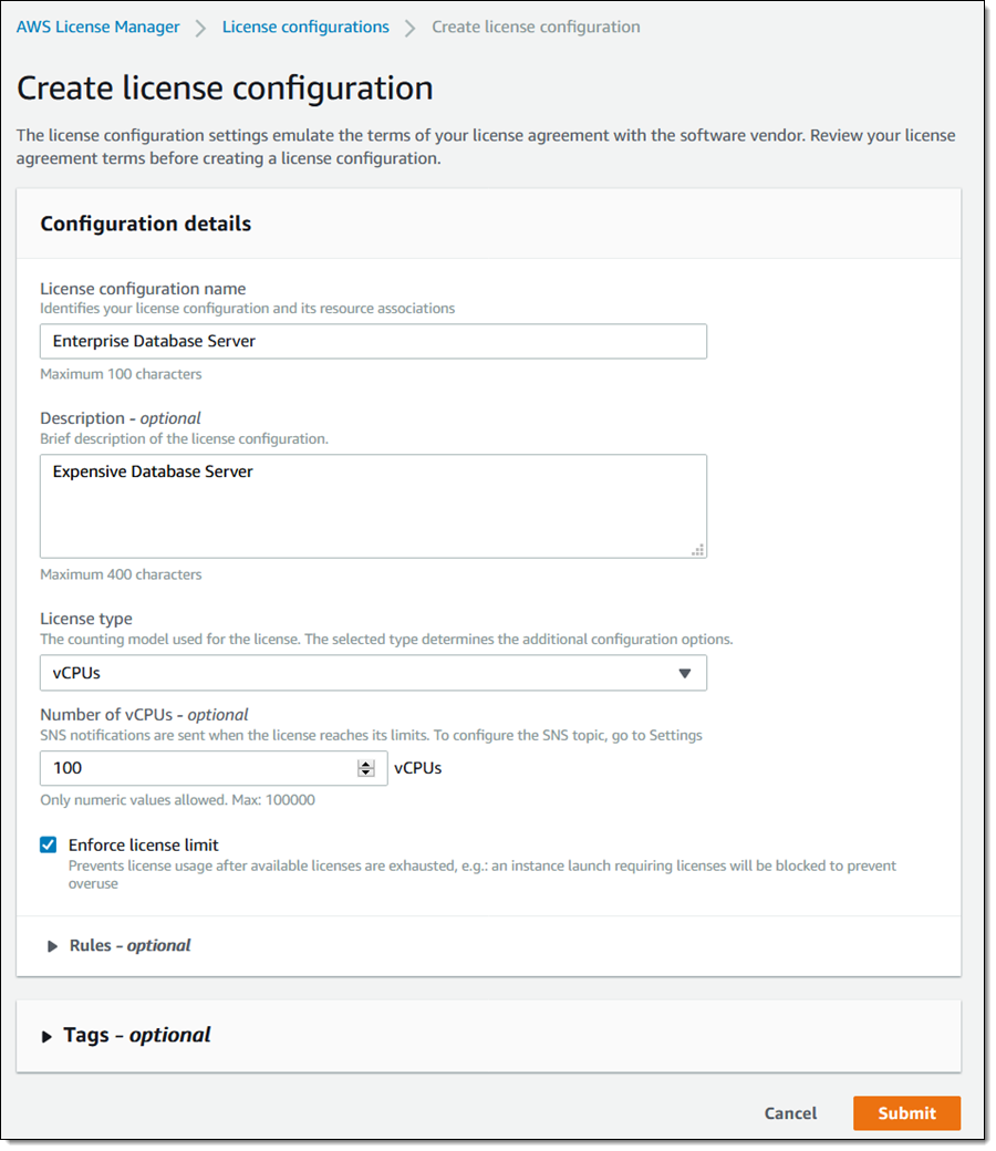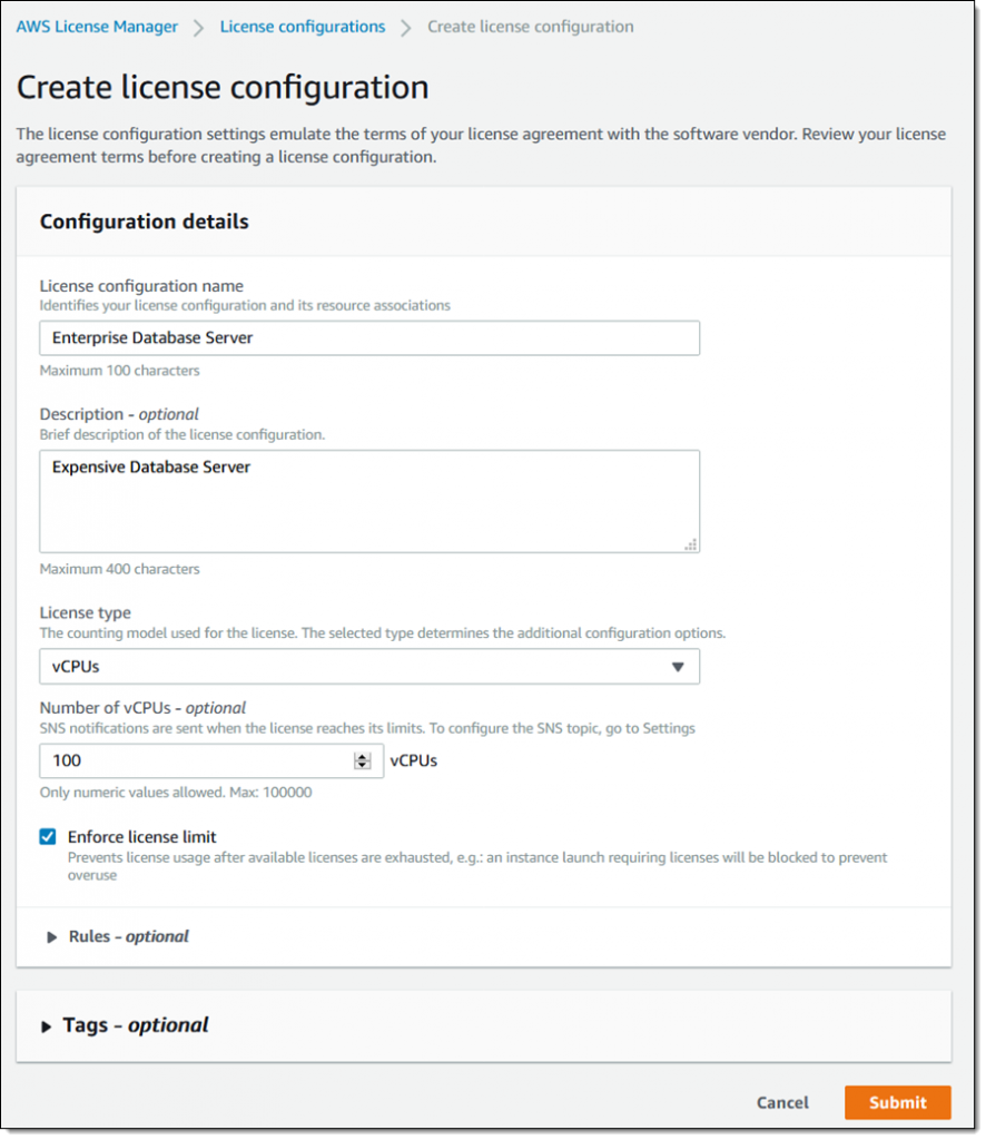 サポートされるライセンスタイプ – AWS License ManagerはvCPU、物理コア、物理ソケットをベースとしたライセンスをサポートします。特定のソフトウェアベンダーに紐づくものではありません。