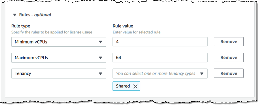 また、新たなライセンスルールを作成することもできます。 ルールは、EC2の構成に対するライセンスの適用可否を制御します。 vCPUの最小数や最大数、EC2テナントタイプ (共有、専有インスタンス、Dedicated Host) を指定できます。 例えば 4~64のvCPUと共有テナントを指定するルールは次のようになります: