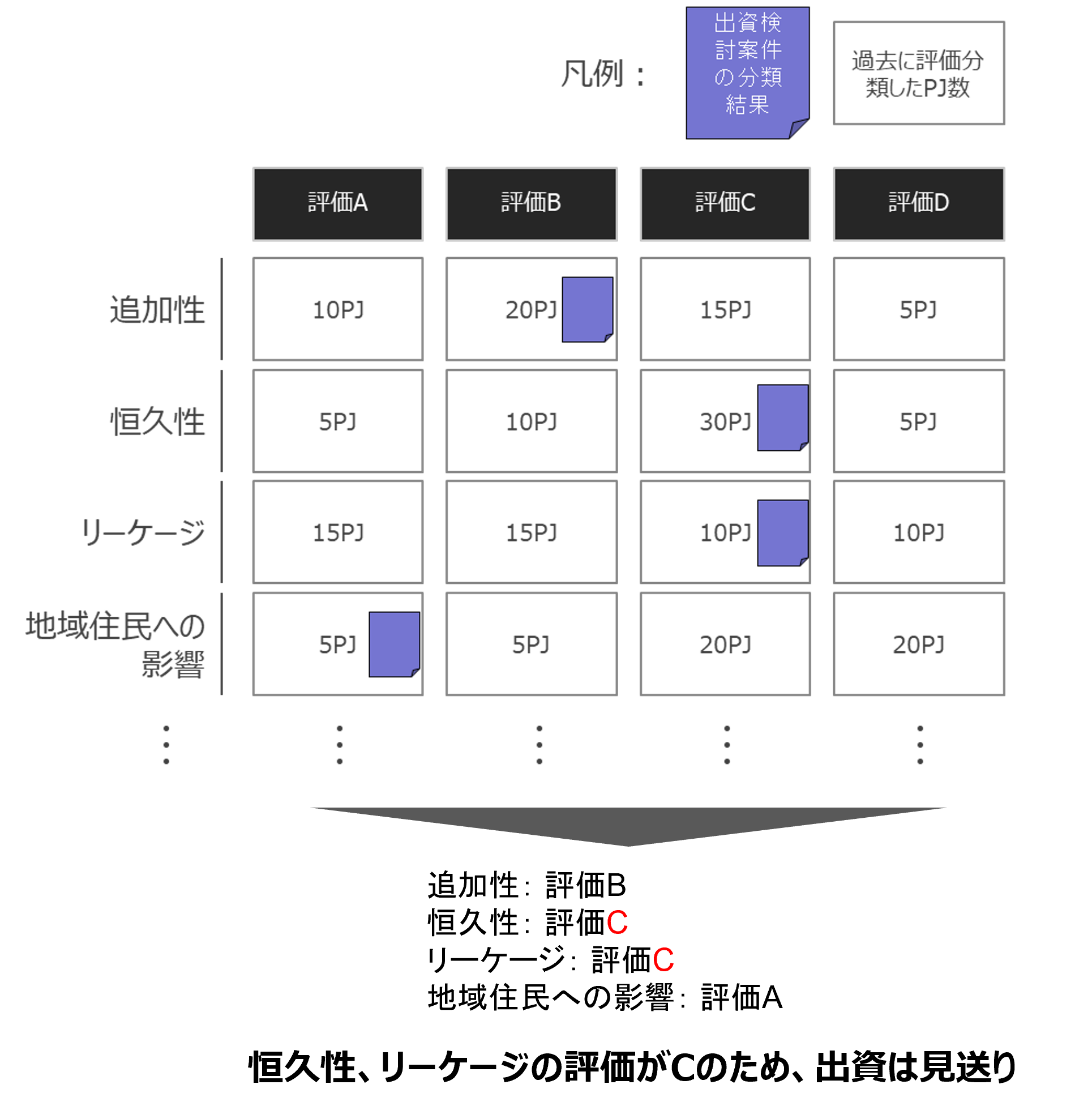 図 3 のように、既存の同類プロジェクトと同じ軸で評価をし、相対的にどのような品質であるか、リスクがあるかを可視化することで偏りのない適切なスクリーニングに繋がると考えています。
