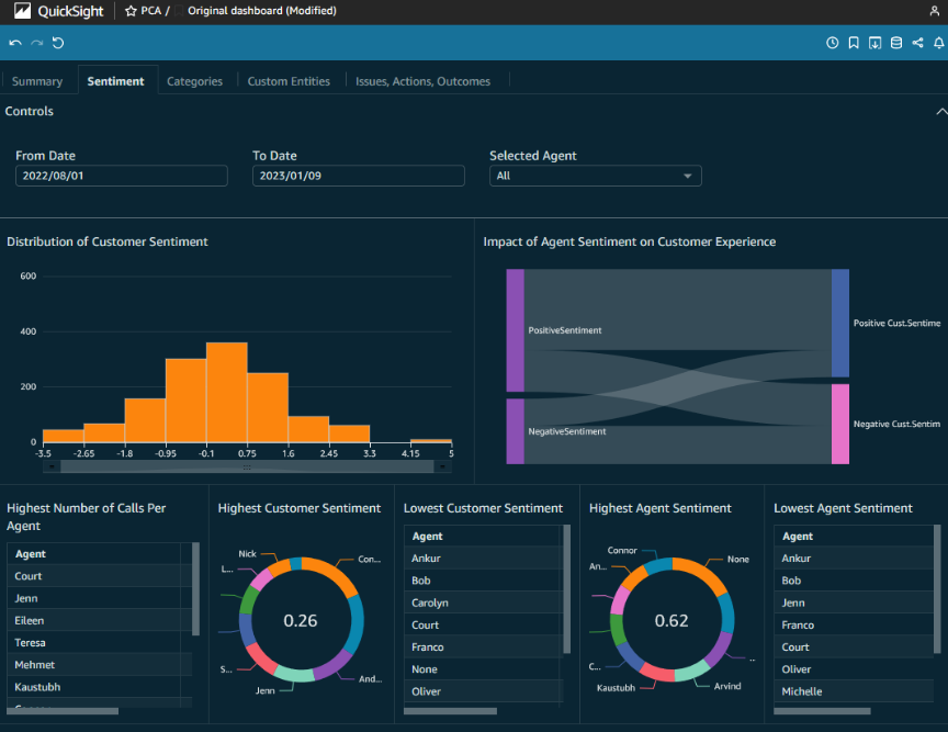 通話録音を提供していただくと、PCA は Amazon Transcribe Call Analytics やその他の AWS サービスを使用して自動的に処理し、顧客やエージェントのセンチメント、電話をかけた理由、話し合ったエンティティ、会話の特徴(非通話時間、中断、音量、通話速度など)などの貴重な情報を抽出します。Amazon Transcribe Call Analytics は、何千時間もの会話を使ってトレーニングされたビルトインの ML モデルを使用して問題を検出します。自動通話分類機能を使用すると、キーワードやフレーズ、センチメント、非通話時間に基づいて会話にタグを付けることもできます。また、名前、住所、クレジットカード番号、社会保障番号などの機密顧客データを記録ファイルと音声ファイルの両方から任意でマスキングすることができます。