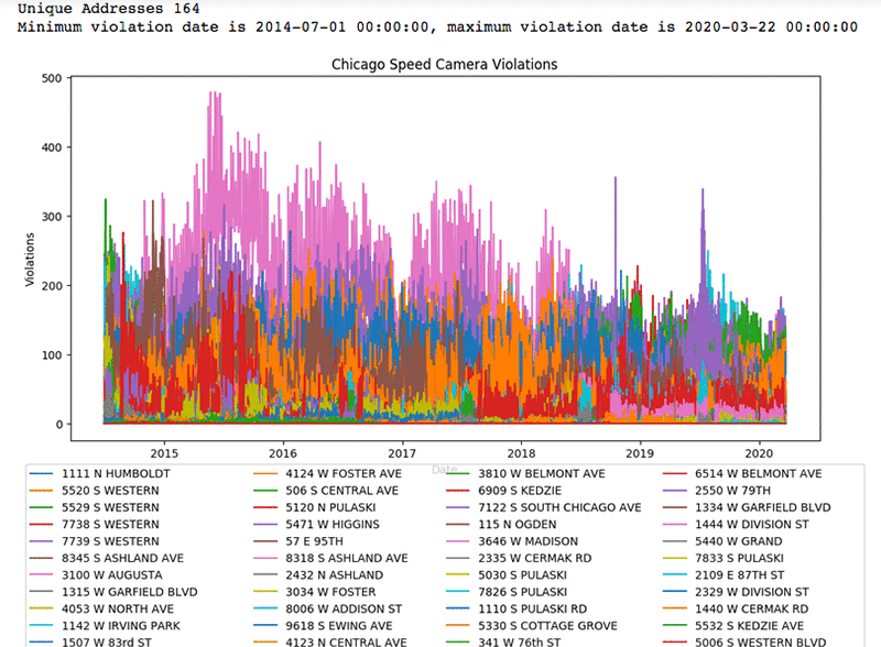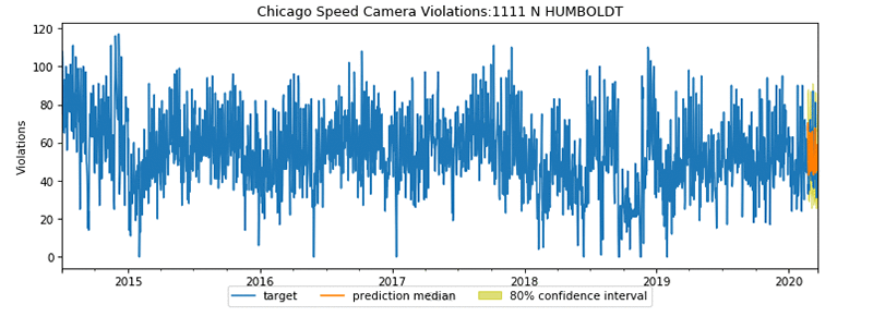 時系列予測を説明するために、DeepAR アルゴリズムを使用してシカゴの速度違反カメラデータセットを分析します。データセットは Data.gov によってホストされ、米国総務局、テクノロジートランスフォーメーションサービスによって管理されています。これらの違反はカメラシステムによってキャプチャされ、シカゴデータポータルで利用できます。データセットを使用して、データのパターンを識別し、有意義な洞察を得ることができます。