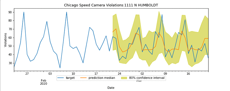 上に表示されたパターンは、予測が 80% の信頼度内でターゲットとテストデータ通りであることを示しています。また、1111 N HUMBOLDT 通りの場所が、週末 2020 年 1 月 31 日、2020 年 2 月 8 日、2020 年 2 月 15 日 (すべて土曜日) に急上昇していることも示しています。
