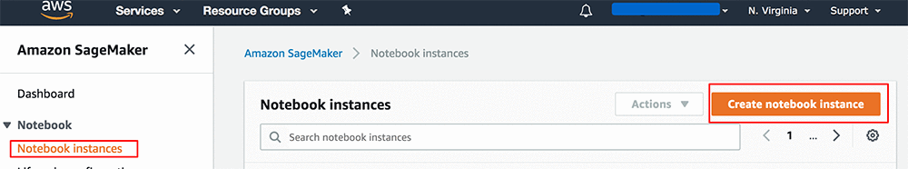 SageMaker のランディングページの左のペインで [Notebook instances] を選択し、[Create notebook Instance] を選択します。