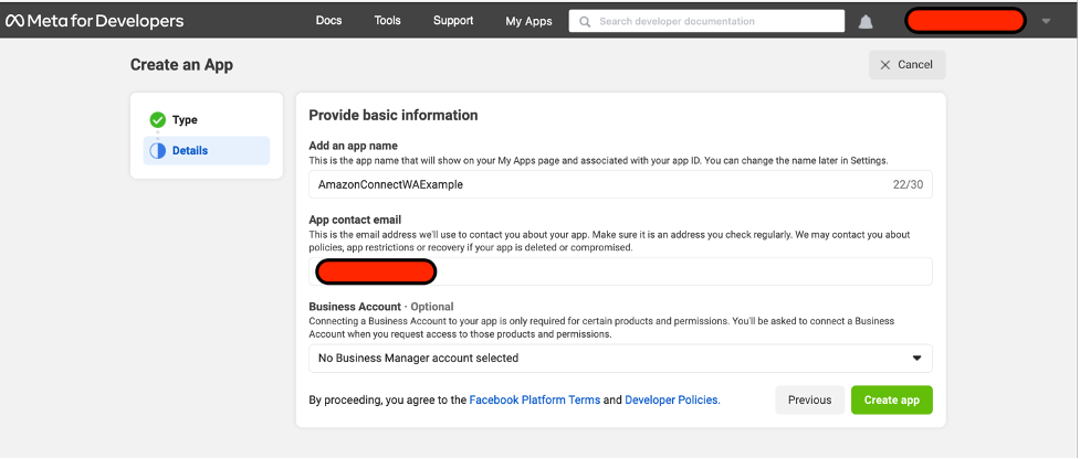- アプリの表示名、連絡先メールアドレス、ビジネスアカウント を紐づけるかどうかを選択し、アプリを作成 をクリックします。