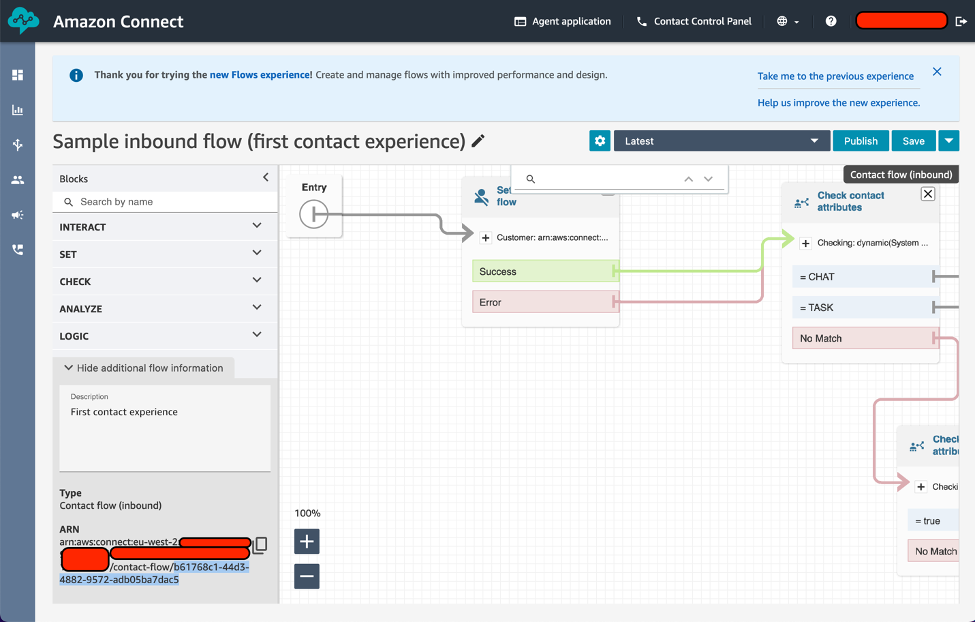 - Amazon Connect 管理コンソールにログインし、コンタクトフロー の画面を開きます。WhatsAppチャネルでチャットを開始させたい コンタクトフロー を選択し、その コンタクトフローID をメモします。