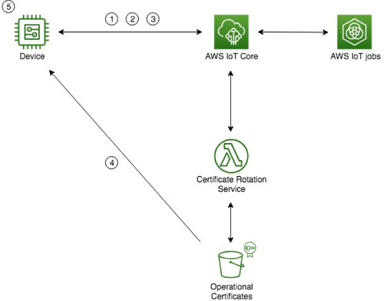 - デバイスはブートストラップ証明書を使用してAWS IoT Coreに接続し、証明書ローテーションジョブが送られてきます