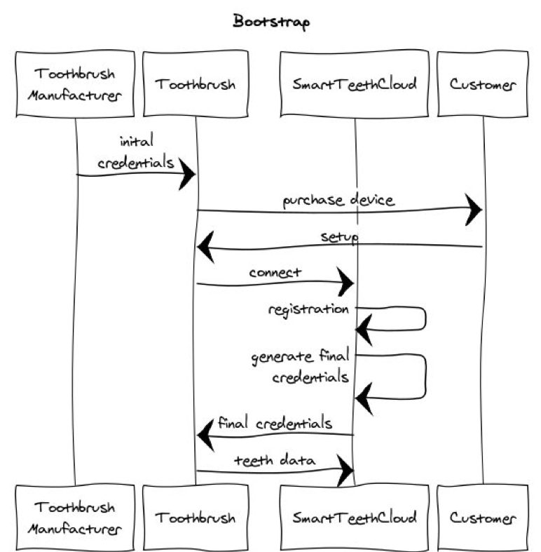 初期の証明書は、歯ブラシがクラウドに繋がって自分自身を登録し、必要な権限一式が付与された証明書をリクエストすることのみを許可している状況が理想的です。さらに、このプロセスが自動化されており、SmartTeethの顧客からは透過的であること、そして歯ブラシが初めて接続する時、クラウドで必要なリソースが全て作成され、初期の証明書と実用フェーズの証明書を入れ替える部分をファシリテートする形が理想的です。