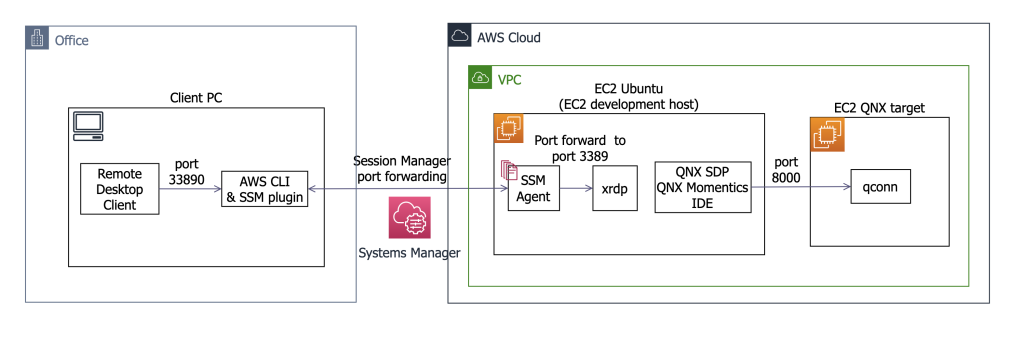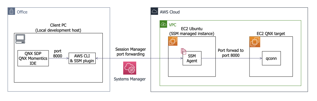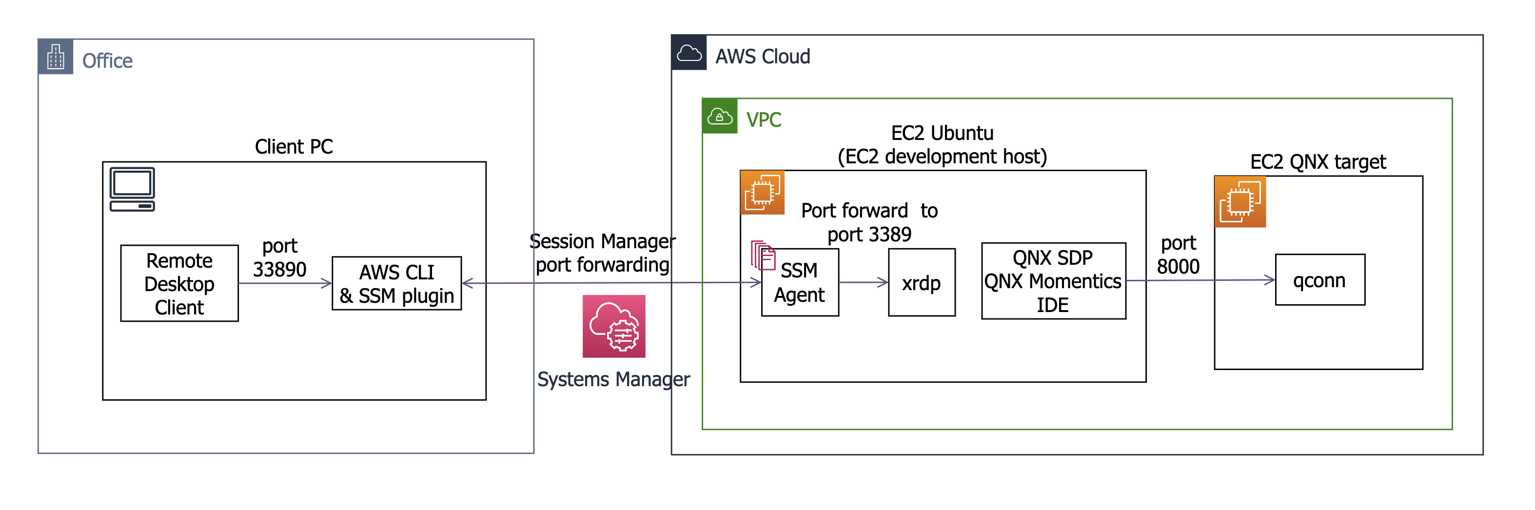 ローカル開発用ホスト: QNX SDP は クライアント PC 上にインストールされます。開発者は、ローカル開発用ホストにローカルログインして利用します。開発者は、EC2 QNX インスタンスへ、ローカル開発用ホストにインストールされた QNX SDP から SSM ポートフォワーディングを使用してアクセスします。