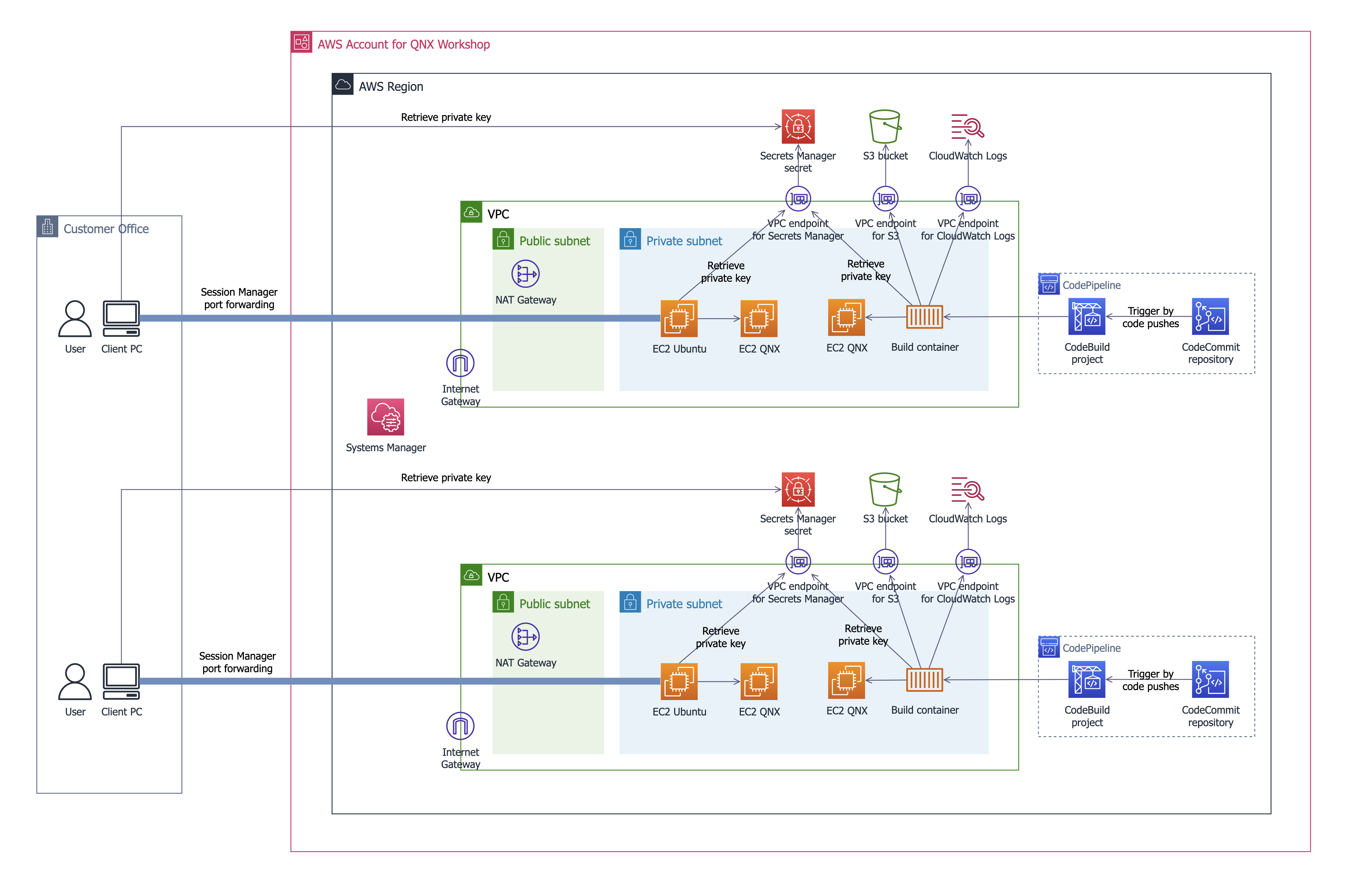 - ワークショップでは、VPC、EC2 Ubuntu インスタンス、EC2 QNX インスタンスなどのリソースをユーザーごとにデプロイします。