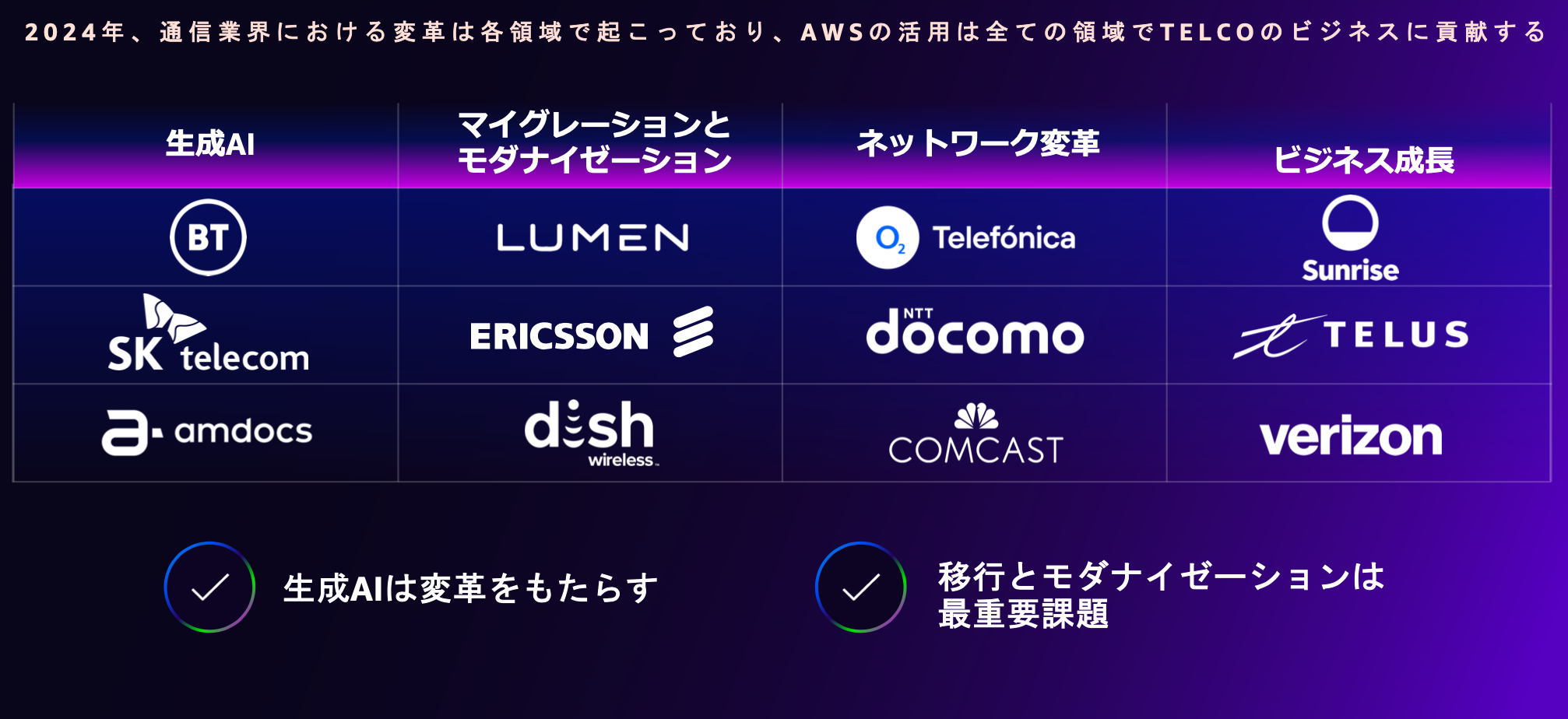 結論として、2024年のテレコム業界では、生成AI、マイグレーションとモダナイゼーション、ネットワーク変革、ビジネス成長戦略の各領域で通信業界における変革は起こっており、これらの全ての領域で通信事業者様のビジネスにAWSは貢献することが可能です。