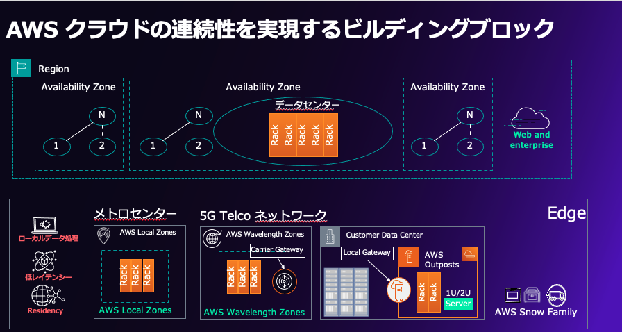 これらの課題に対し、AWS はクラウドインフラストラクチャの連続性、同一性、自動化を備え、場所を問わず統一された環境を提供することで、ビジネスバリューチェーン全体とネットワークトポロジー全体をカバーする包括的なクラウドソリューションを実現します。